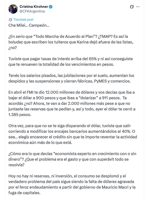 Cristina Fernández de Kirchner publicó un nuevo guiño hacia el presidente Javier Milei, iniciando una vez más con su clásico “che”, esta vez por la suba del dólar: “¿En serio que ‘Todo Marcha de Acuerdo al Plan?”, lanzó. “Che Milei… Campeón… ¿En serio que “Todo Marcha de Acuerdo al Plan”? ¿TMAP? Es así la boludez que escriben los tuiteros que Karina dejó afuera de las listas, ¿no?”, lanzó Fernández de Kichner en su cuenta de la red social X, en referencia a los seguidores del Presidente que no fueron incluidos como candidatos para las elecciones del 7 de septiembre en la provincia de Buenos Aires. Desde su prisión domiciliaria, la ex vicepresidente arremetió contra el mandatario por las medidas económicas tomadas en su gestión, comenzando por el pago de tasas de interés por encima del 65%: “Y ni así conseguiste que te renueven la totalidad de los vencimientos en pesos. Tenés los salarios pisados, las jubilaciones por el suelo, aumentan los despidos y las suspensiones y cierran fábricas, PyMES y comercios", sostuvo. "En abril el FMI te dio 12.000 millones de dólares y vos decías que iba a bajar el dólar a 900 pesos y que ibas a 'dolarizar' a 911 pesos. Te acordás ¿no? Ahora, te van a dar 2.000 millones más pese a que no juntaste las reservas que te pedían y, así y todo, ayer el dólar te cerró a 1.385 pesos", agregó. "Otra vez, para que no se te siga disparando el dólar, tuviste que salir corriendo a modificar los encajes bancarios aumentándolos al 40%. O sea… Elegís encarecer el crédito sin que te importe reventar la actividad económica aún más de lo que está”, opinó Fernández de Kirchner. Y siguió: “¿Cómo era lo que decías “economista experto en crecimiento con o sin dinero”? ¿Que el problema era el gasto y que con superávit todo se resolvía? Hoy no hay ni reservas, ni inversión, el consumo se desplomó y el verdadero problema del país sigue siendo la falta de dólares agravada por el feroz endeudamiento a partir del gobierno de Mauricio Macri y la fuga de capitales”.