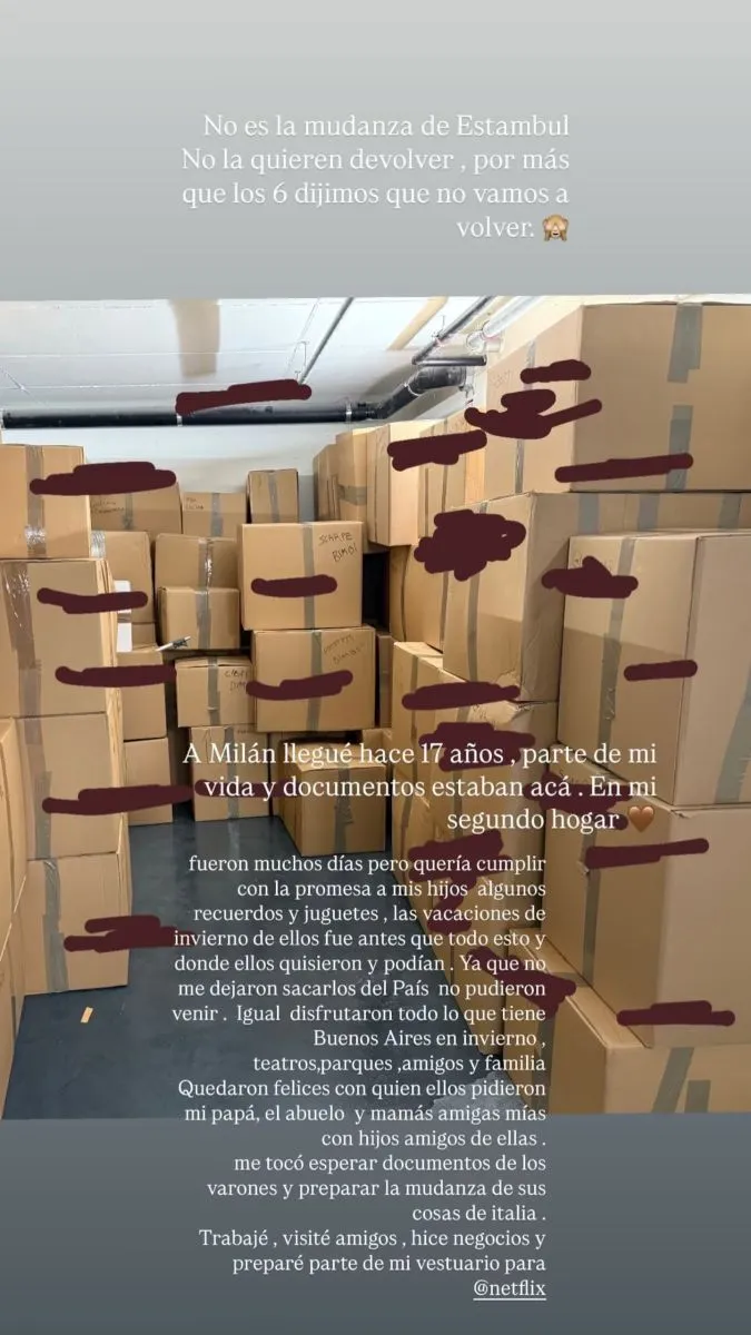 La empresaria compartió una imagen con decenas de cajas y publicó un largo texto en el que dejó entrever tensiones, hizo un fuerte descargo y reveló el detrás de escena de su regreso a Argentina.