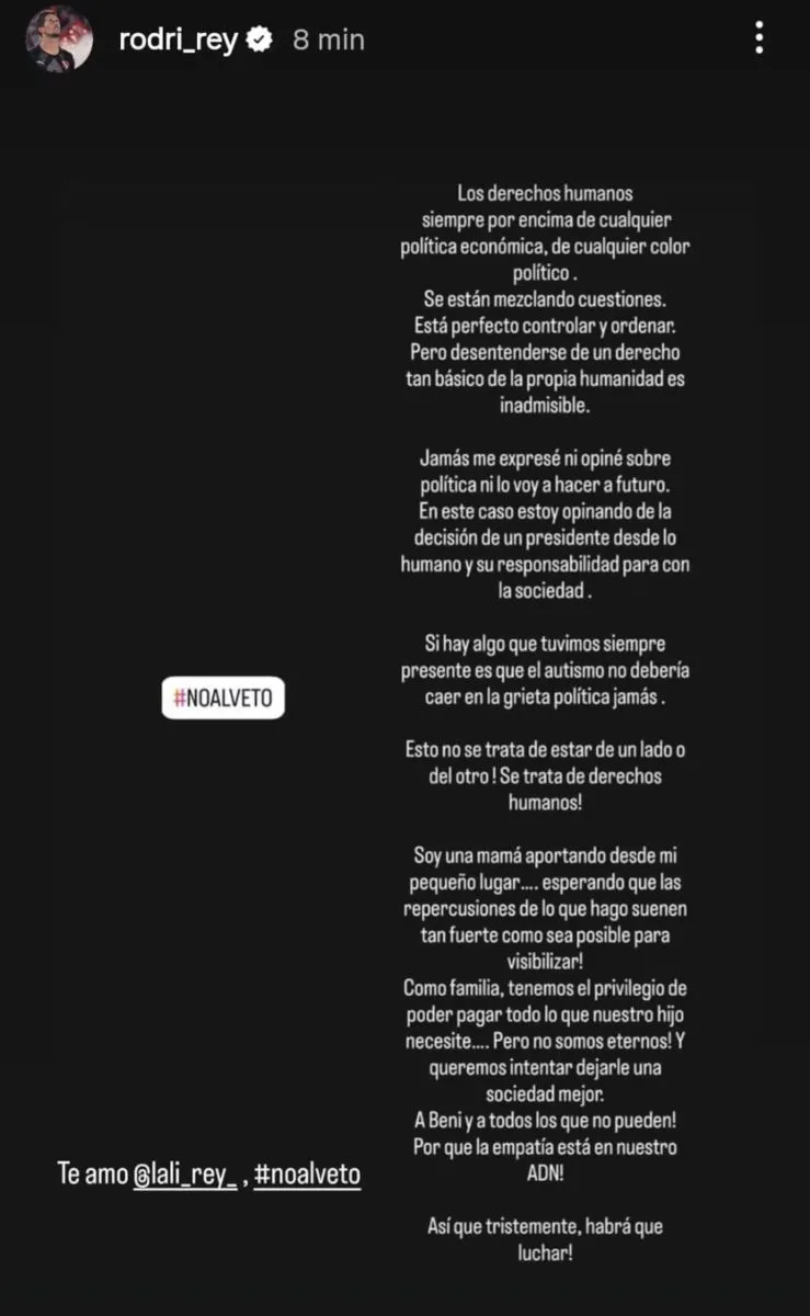 En ese mismo posteo, dejaron en claro que: “Jamás me expresé ni opiné sobre política ni lo voy a hacer a futuro. En este caso estoy opinando de la decisión de un presidente desde lo humano y su responsabilidad con la sociedad. Si hay algo que tuvimos siempre presente, es que el autismo no debería caer en la grieta política jamás”.