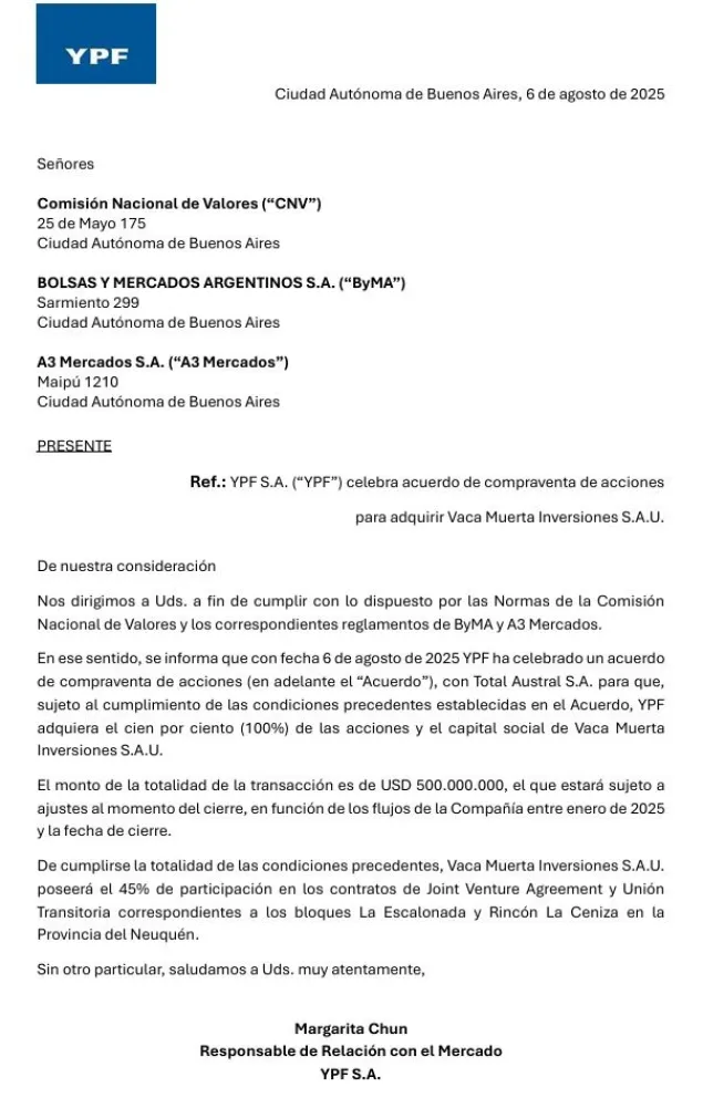 YPF firmó un acuerdo con Total Austral para adquirir el 100% de las acciones de Vaca Muerta Inversiones S.A.U., sociedad titular del 45% de participación en los bloques La Escalonada y Rincón La Ceniza, ubicados en la formación Vaca Muerta, en la provincia de Neuquén. La operación fue informada este 6 de agosto a la Comisión Nacional de Valores y representa un nuevo paso en la estrategia de expansión de la petrolera argentina.