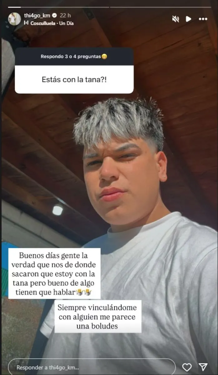 Ante la insistencia de los fans, Medina desmintió la versión: “Buenos días, gente, la verdad que no sé de donde sacaron que estoy con la Tana, pero bueno, de algo tienen que hablar. Siempre vinculándome con alguien, me parece una boludez”.