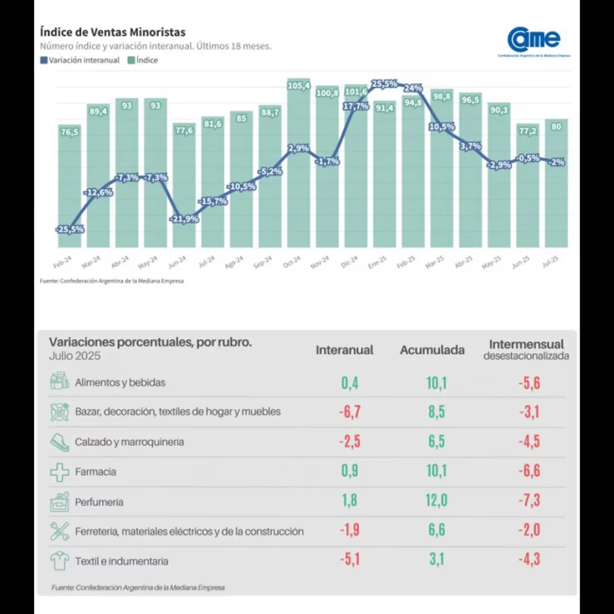Las ventas minoristas de las pymes argentinas registraron en julio su cuarto retroceso consecutivo, según datos de la Confederación Argentina de la Mediana Empresa (CAME). En la comparación interanual, la baja fue del 2%, mientras que frente a junio la caída alcanzó el 5,7%. Ni el cobro del aguinaldo ni el movimiento generado por las vacaciones de invierno lograron revertir la tendencia negativa que arrastra el sector. El bajo poder adquisitivo continúa siendo el principal obstáculo para el repunte comercial. Sin embargo, en el acumulado de los primeros siete meses de 2025, las ventas reflejan un crecimiento del 7,6% frente al mismo período del año pasado.