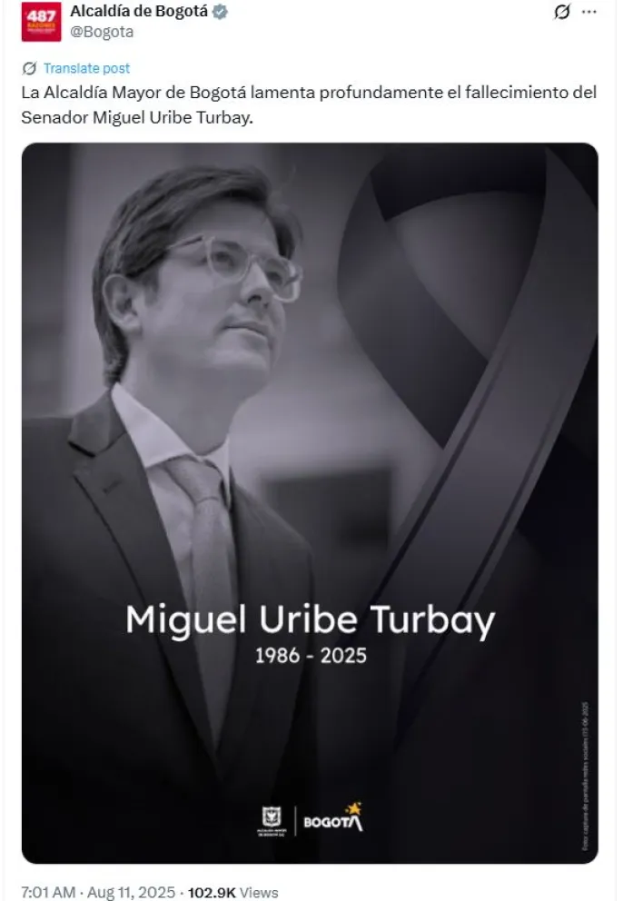 La Alcaldía Mayor de Bogotá emitió en la madrugada de este lunes una publicación en su cuenta oficial de la red social X en la cual lamentó “profundamente el fallecimiento del Senador Miguel Uribe Turbay”.