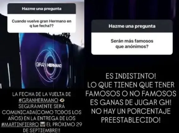 Una de los primeros interrogantes fue: "¿Cuándo vuelve Gran Hermano? En qué fecha?", a lo que el presentador reveló: "La fecha de la vuelta de Gran Hermano seguramente será comunicada (como todos los años) en la entrega de los Martín Fierro, el próximo 29 de septiembre".