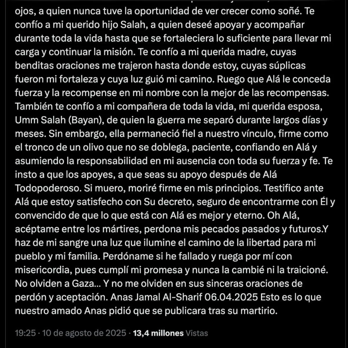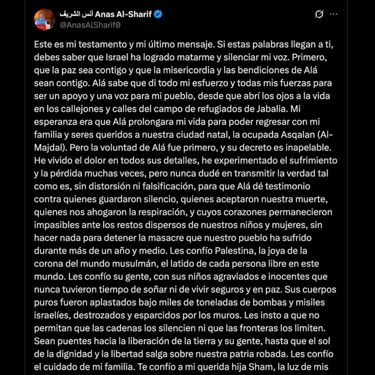 En su última publicación en redes sociales, Al-Sharif escribió: “Si estas palabras te llegan, sabrás que Israel ha logrado matarme y silenciar mi voz.”