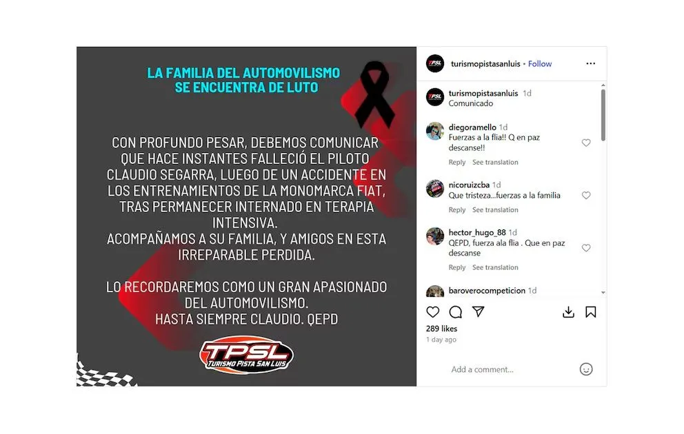 Dolor en el automovilismo argentino por la muerte del cordobés Claudio Segarra, quien sufrió un grave accidente durante los entrenamientos de la Monomarca Fiat en el marco del Turismo Pista San Luis.