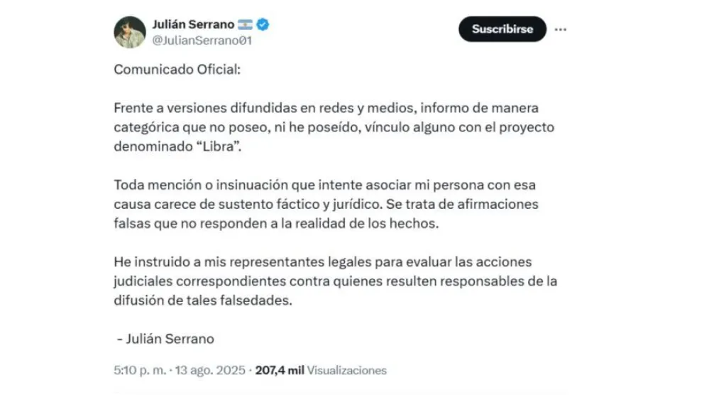 El actor publicó un mensaje en su cuenta de X para desmentir las versiones: “Frente a versiones difundidas en redes y medios, informo de manera categórica que no poseo, ni he poseído, vínculo alguno con el proyecto denominado Libra”. Además, remarcó: “Toda mención o insinuación que intente asociar mi persona con esa causa carece de sustento fáctico y jurídico. Se trata de afirmaciones falsas que no responden a la realidad de los hechos”.