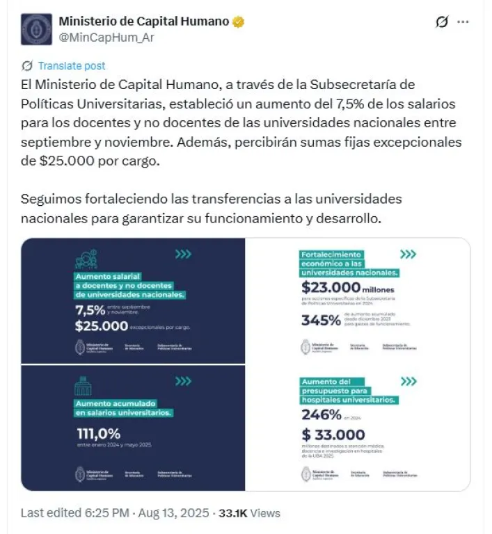 En medio de una semana de paros y reclamos, la Secretaría de Educación dispuso que se aplicará un aumento en los salarios de docentes y demás personal de las universidades nacionales, además del pago de $ 25.000 en concepto de sumas fijas excepcionales por cada cargo ostentado. El aumento del 7,5% fue anunciado a través de X por el Ministerio de Capital Humano, al cual pertenece la Secretaría de Educación, para incrementar los salarios del personal docente y no docente "entre septiembre y noviembre". "Seguimos fortaleciendo las transferencias a las universidades nacionales para garantizar su funcionamiento y desarrollo", explicaron desde la cartera que conduce Sandra Pettovello. Desde el Ministerio de Capital Humano quisieron recordar a la población que los salarios del personal docente y no docente aumentaron un 111% entre enero de 2024 y mayo de 2025, pero la inflación acumulada rondó los 146,6% en ese período. Además se informó de un aumento del 246% en el presupuesto ejecutado el año pasado en hospitales universitarios, pero sin hacer mención al punto de partida sobre el que se aplicó ese porcentaje ni sobre maniobras similares en 2025 (sin una ley de Presupuesto en 2024 ni 2025). Al margen del anuncio del Gobierno, el Instituto Nacional de Estadística y Censos (INDEC) informó este miércoles que la inflación de julio de 2025 fue del 1,9%, y que el índice acumulado en lo que va del año se ubicó en 15,1%, lo que deja corta la recomposición del 7,5%.