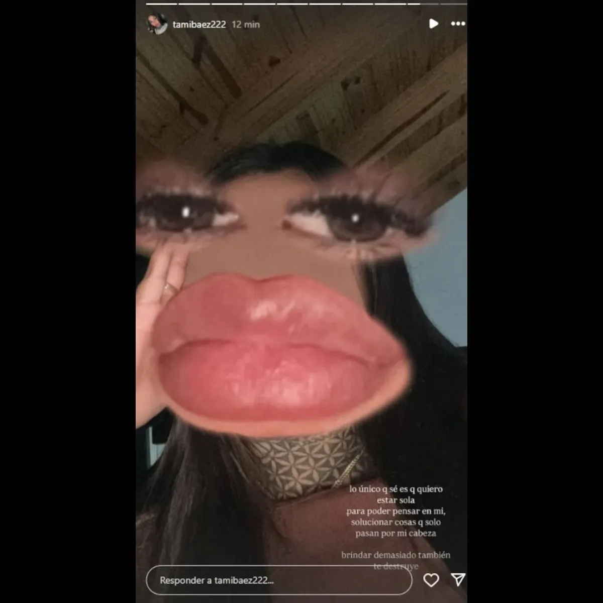 Tamara Báez generó revuelo en sus redes sociales este jueves con un mensaje que reveló un cambio en su situación sentimental. A través de sus historias de Instagram, la influencer escribió: “Lo único que sé es que quiero estar sola para poder pensar en mí, solucionar cosas que solo pasan por mi cabeza. Brindar demasiado también te destruye”, acompañado de una imagen con un filtro que exagera ojos y boca simulando un animal.