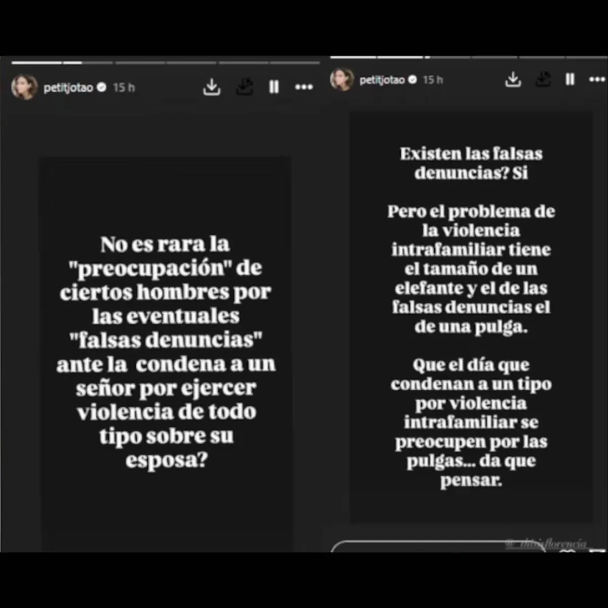 A través de Instagram, Ortega compartió un sentido mensaje para su cuñada, apuntando directamente a quienes cuestionan los testimonios: “¿No resulta llamativa la ‘preocupación’ de ciertos hombres por las supuestas ‘falsas denuncias’ justo cuando se condena a un hombre por ejercer violencia sistemática sobre su esposa?”. La actriz profundizó su reflexión con otra publicación: “¿Existen las falsas denuncias? Sí. Pero el problema de la violencia intrafamiliar tiene el tamaño de un elefante, mientras que las falsas denuncias son como una pulga. Que el día en que un agresor recibe una condena, algunos se preocupen por las pulgas… da que pensar”.