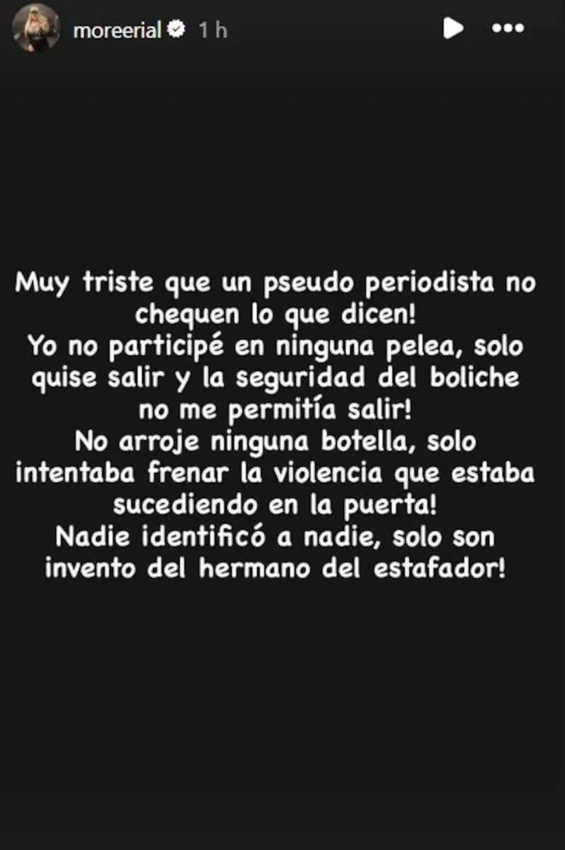 En su descargo, More Rial desmintió haber participado en una pelea: “Yo no arrojé ninguna botella, solo intentaba frenar la violencia que había en la puerta. No identifiqué a nadie, todo son inventos”, sostuvo.