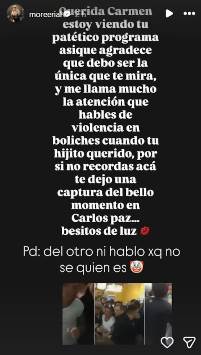 Lejos de bajar la tensión, Carmen fue irónica y hasta agradeció a Morena por “sumar rating”. Incluso la invitó a ver su obra de teatro "Enemigas Íntimas", en Mar del Plata, junto a Luisa Albinoni, prometiendo revelarle en privado cuestiones que no diría al aire.