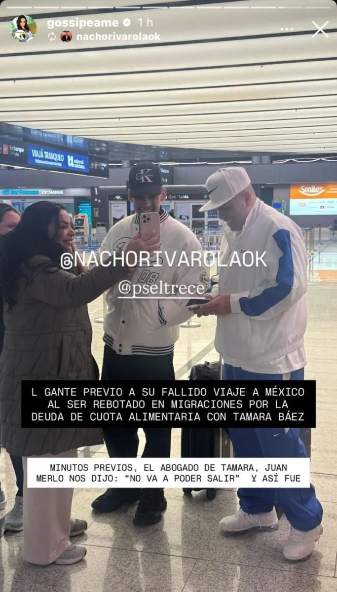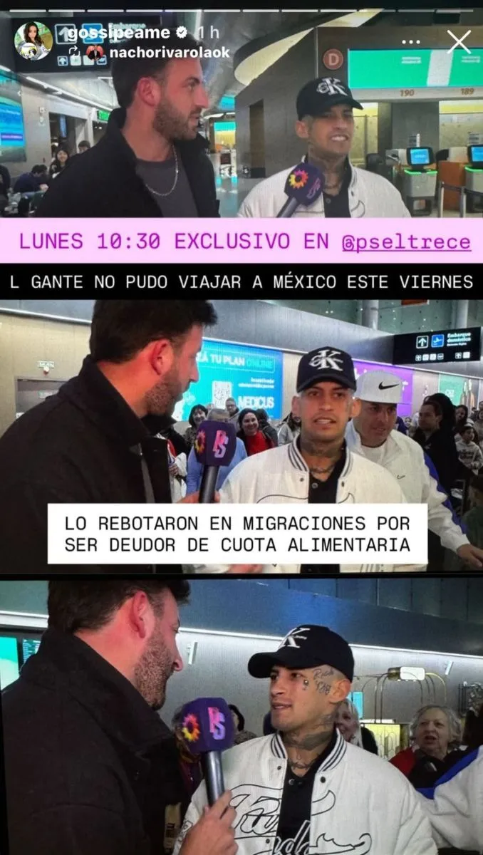 La panelista de Puro Show, Pochi, precisó: “L-Gante no pudo viajar a México este viernes. Lo rebotaron en migraciones por ser deudor de cuota alimentaria”. Además, el periodista Nacho Rivarola confirmó que esta situación le había sido anticipada por el abogado de Tamara Báez, madre de su hija: “No va a poder salir”.