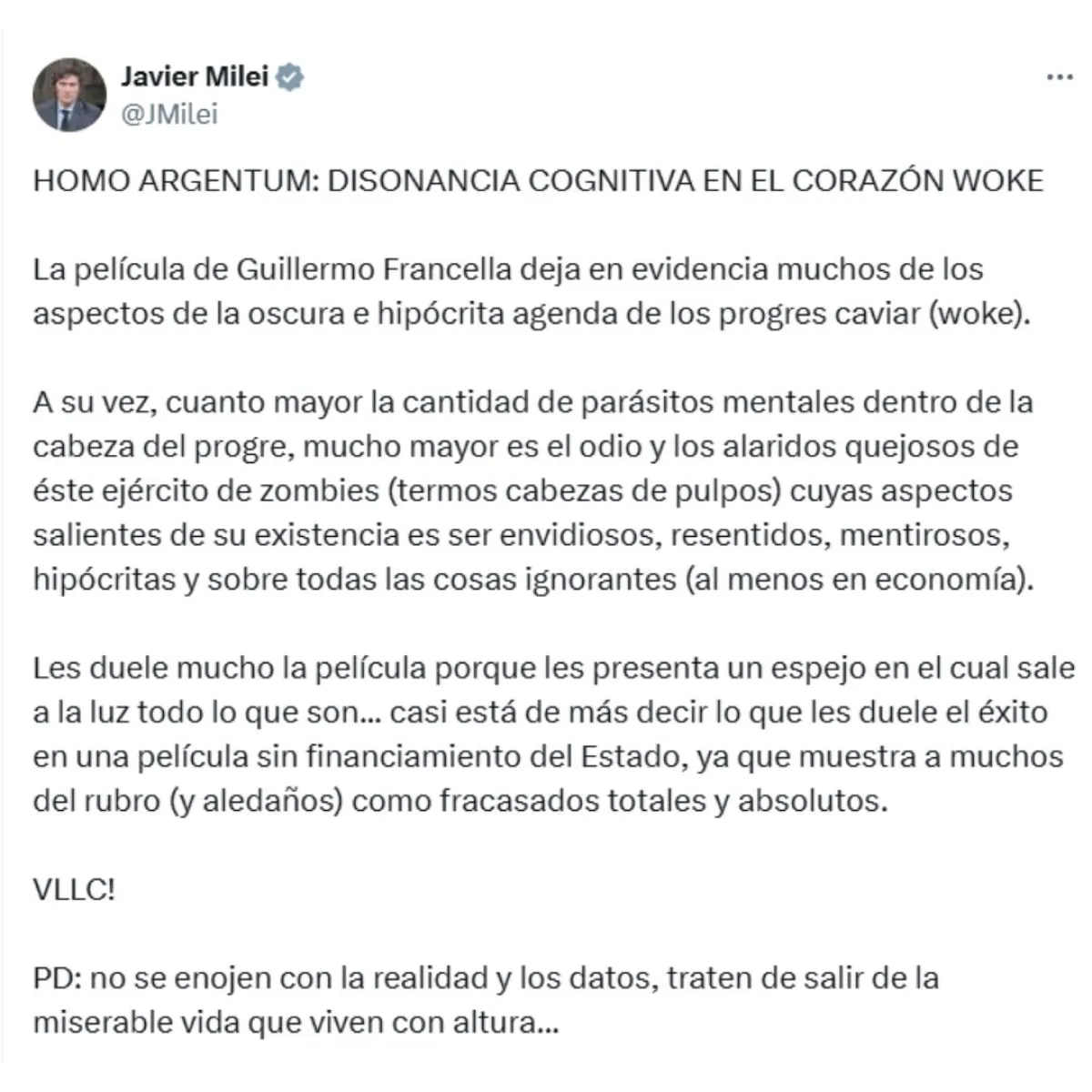 En la misma publicación, Milei expresó: “A su vez, cuanto mayor la cantidad de parásitos mentales dentro de la cabeza del progre, mucho mayor es el odio y los alaridos quejosos de este ejército de zombies (termos cabezas de pulpos) cuyas aspectos salientes de su existencia es ser envidiosos, resentidos, mentirosos, hipócritas y sobre todas las cosas ignorantes (al menos en economía)“.