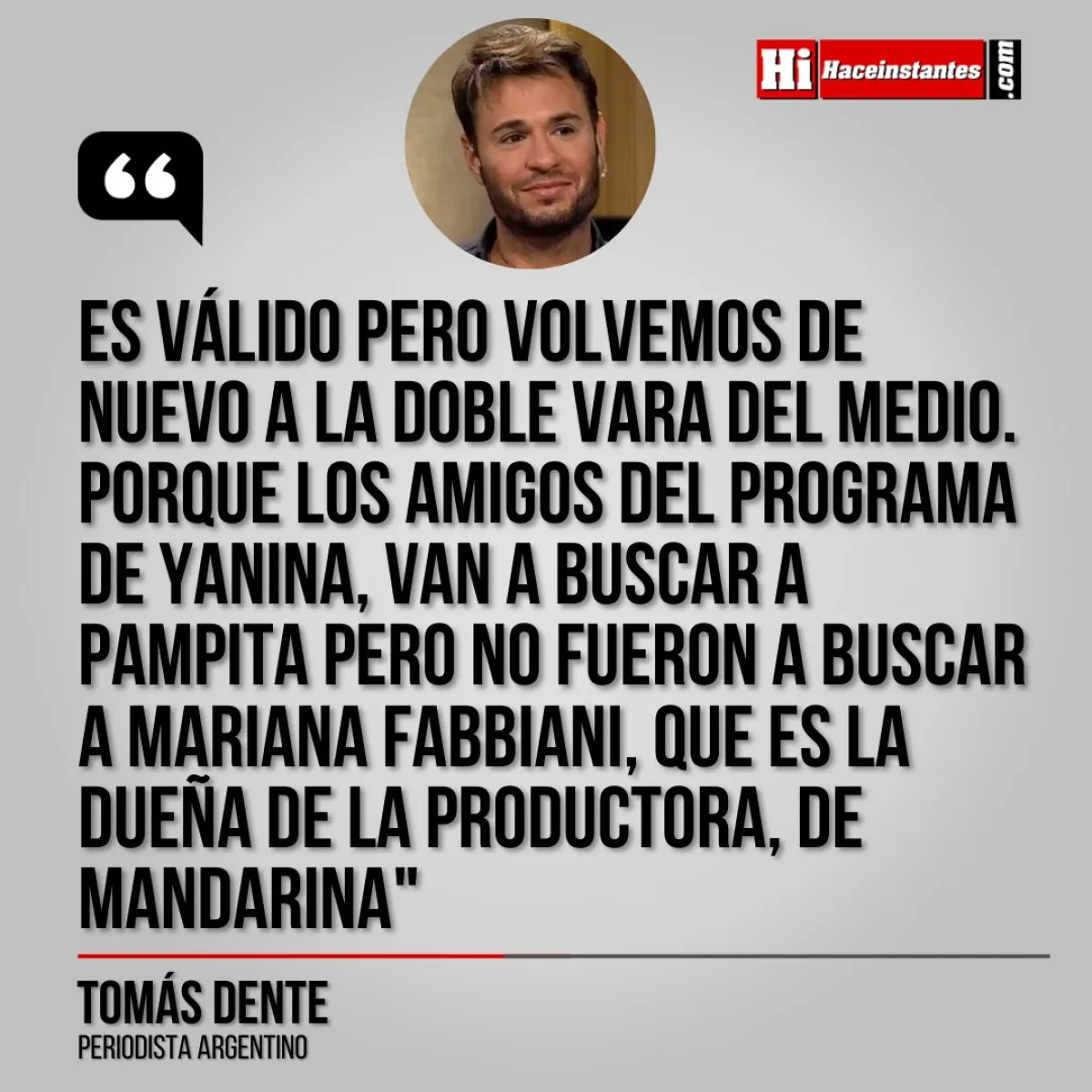 Dente, sin embargo, habló del tema en Entrometidos y cuestionó la doble vara que, según él, aplican algunos medios: "Es válido pero volvemos de nuevo a la doble vara del medio. Porque los amigos del programa de Yanina, van a buscar a Pampita pero no fueron a buscar a Mariana Fabbiani, que es la dueña de la productora, de Mandarina".