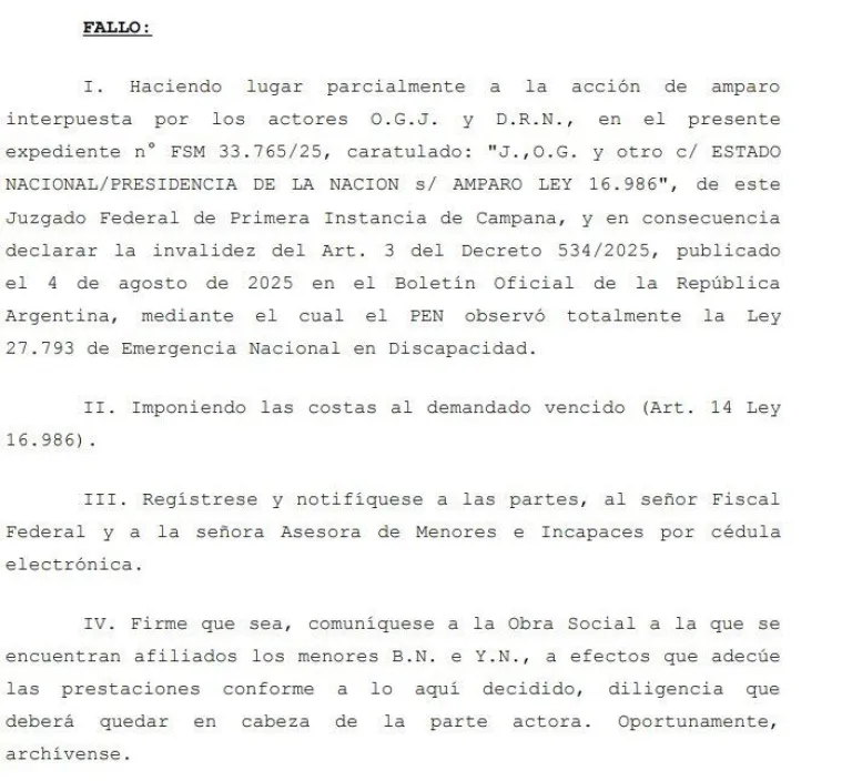 La resolución responde a un recurso de amparo impulsado por familias de dos menores de 11 años que padecen “trastornos generalizados del desarrollo” y “trastornos específicos en las habilidades escolares”. Ambos asisten a instituciones educativas terapéuticas que, según el fallo, podrían cerrar debido al desfinanciamiento estatal, subsistiendo únicamente gracias a préstamos y donaciones.