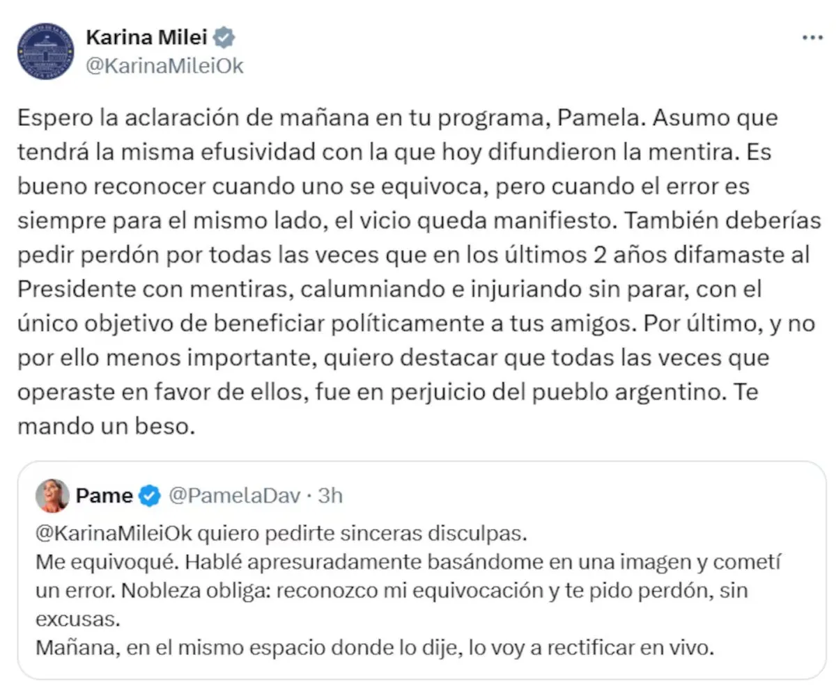 Karina citó el tuit de Pamela y remarcó que espera una aclaración con la misma visibilidad con la que se difundió la mentira. Además, le pidió disculpas por años de supuestas difamaciones hacia el Presidente y señaló que esas acciones perjudicaron al pueblo argentino.