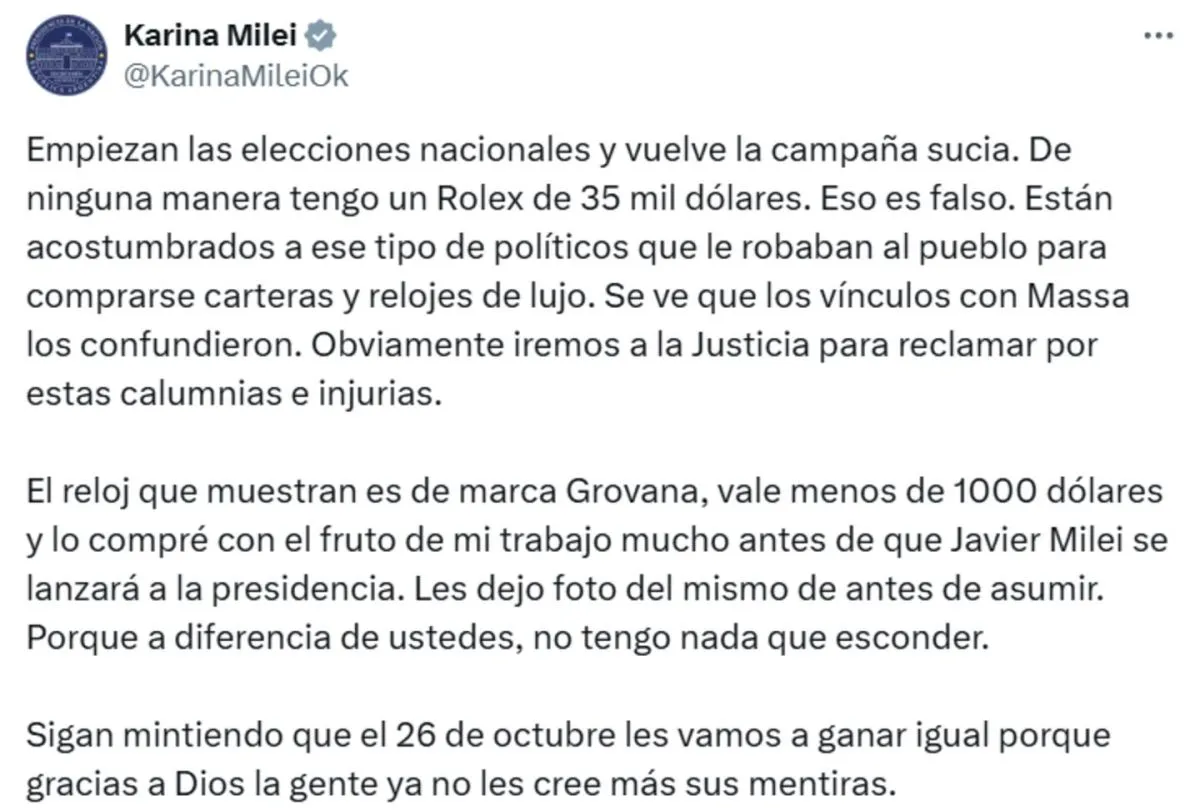 La secretaria general de la Presidencia negó la acusación y aclaró que el reloj en cuestión es una marca Grovana, valorado en menos de 1000 dólares, adquirido antes de que Javier Milei asumiera la Presidencia. Además, anunció que llevará el caso a la Justicia por “calumnias e injurias”.