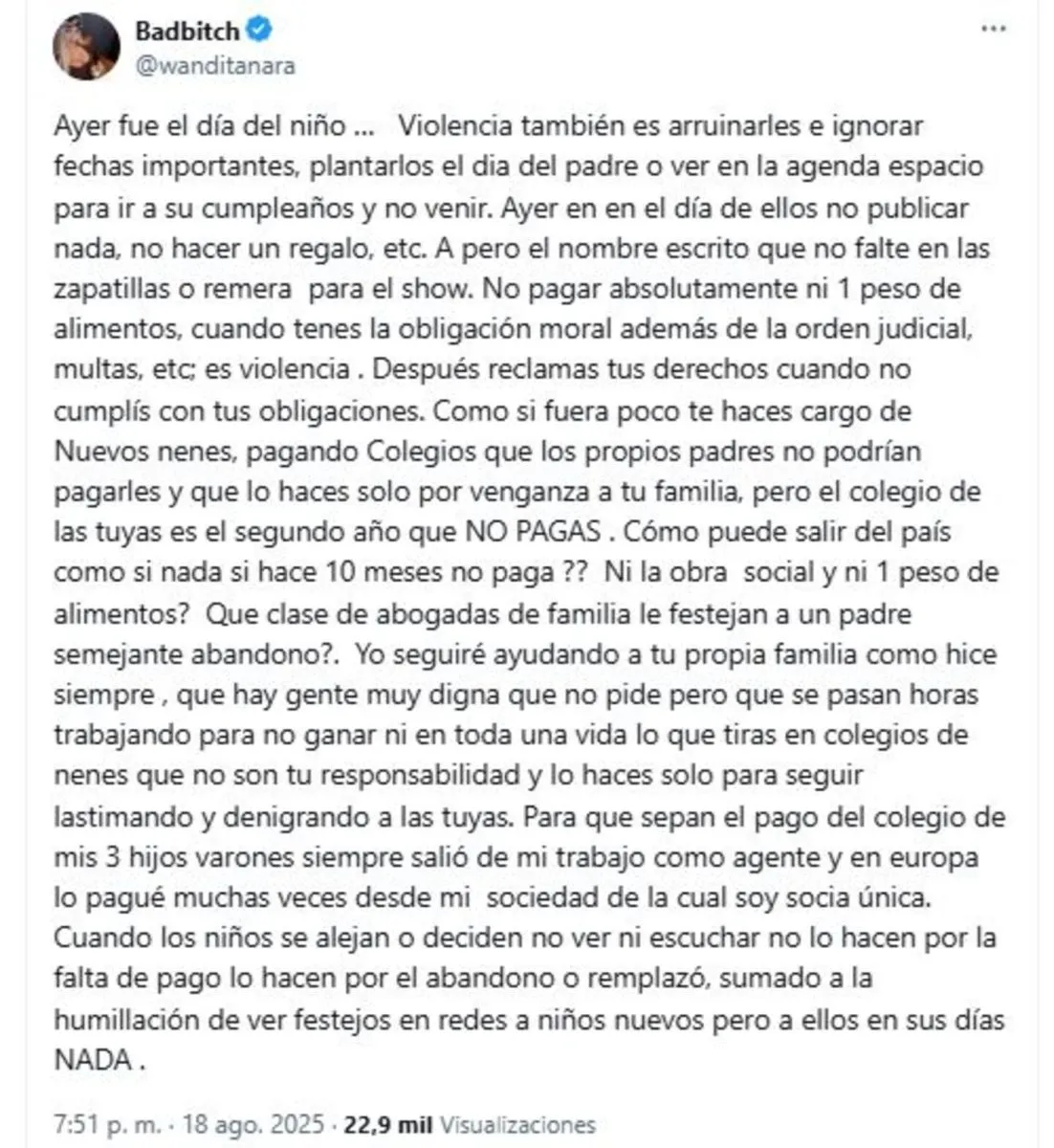 Por último, Wanda dejó en claro que seguirá sosteniendo a sus hijos y cuidando su educación: “El pago del colegio de mis 3 hijos varones siempre salió de mi trabajo y de mi sociedad en Europa. Cuando los niños se alejan, no es por falta de pago, es por abandono y humillación”, cerró, haciendo referencia al silencio de Icardi durante el Día del Niño.