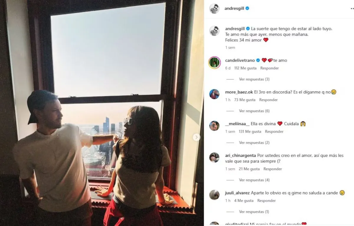 A pesar de los rumores, en sus redes sociales Andrés Gil se mostró enamorado de Vetrano la semana pasada, al dedicarle un tierno posteo por su cumpleaños número 34. “La suerte que tengo de estar al lado tuyo. Te amo más que ayer, menos que mañana. Felices 34, mi amor”, escribió el actor, acompañado de un emoji de corazón rojo.