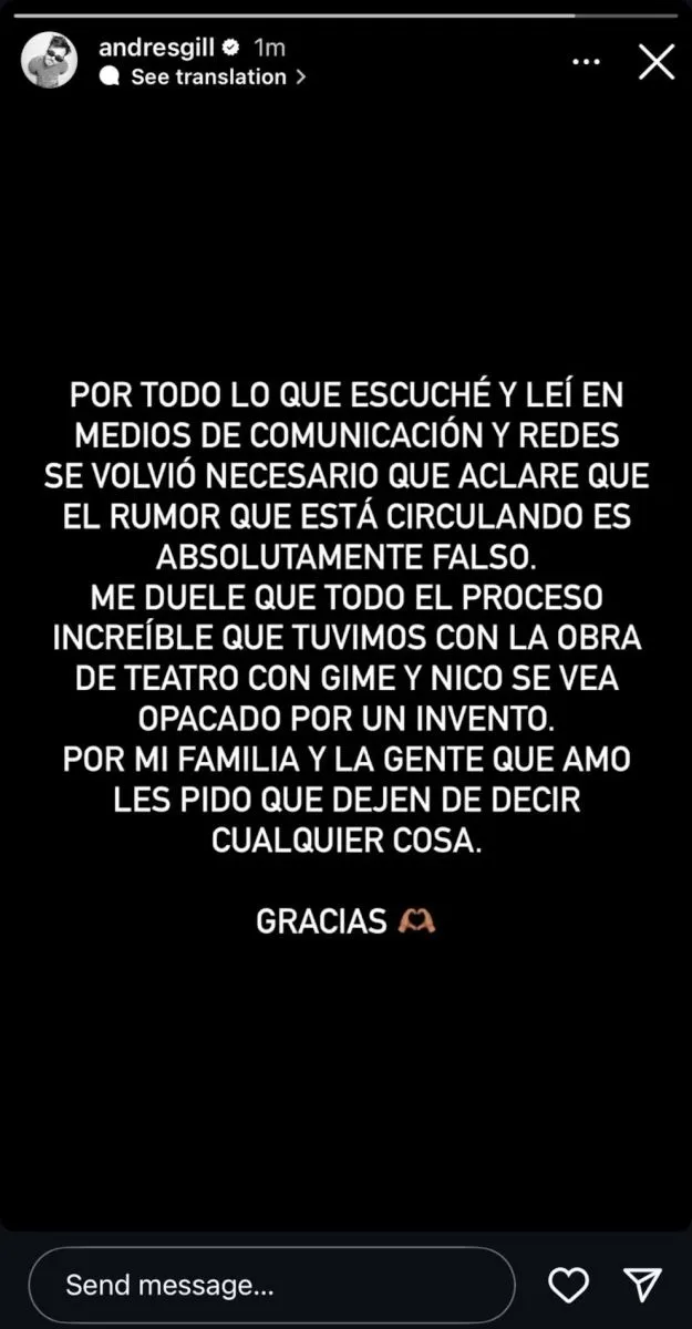 Andrés Gil rompió el silencio y aclaró los rumores que lo señalaban como el tercero en discordia en la separación de Gimena Accardi y Nicolás Vázquez. En sus redes sociales, el actor sostuvo que “el rumor que está circulando es absolutamente falso” y pidió respeto por su familia y seres queridos.