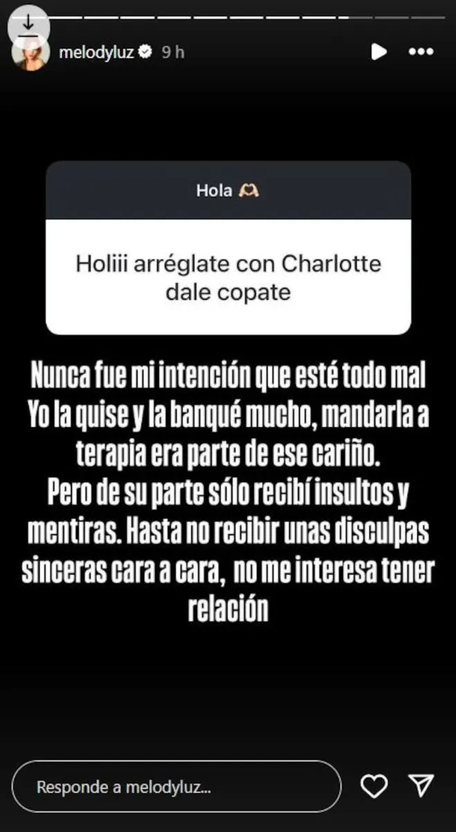 “Hola, arreglate con Charlotte, dale, copate”, le sugirieron en la cajita de preguntas. La respuesta de Melody fue contundente: “Nunca fue mi intención que esté todo mal, yo la quise y la banqué mucho, mandarla a terapia era parte de ese cariño”.