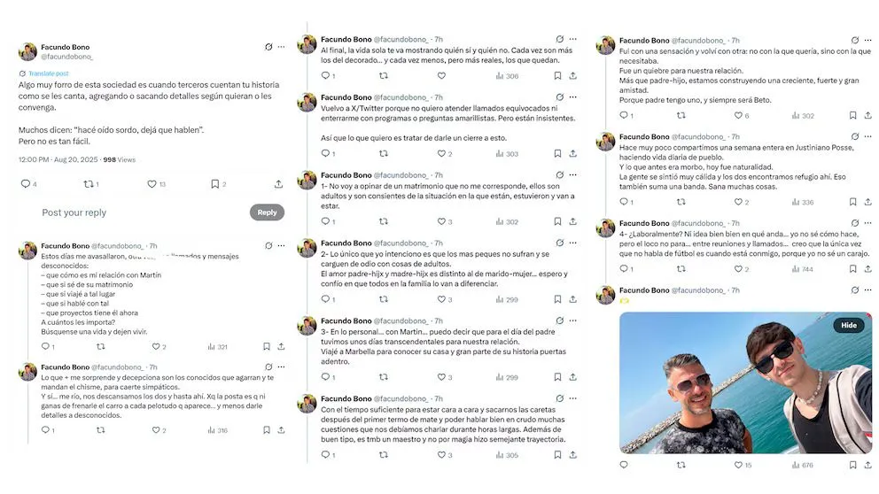 Facundo Bono, hijo extramatrimonial de Martín Demichelis, expresó su hartazgo por la atención pública que generó la separación de su padre y la modelo Evangelina Anderson. A través de su cuenta de X, el joven reclamó respeto por su privacidad y cuestionó el morbo que rodea su historia familiar.