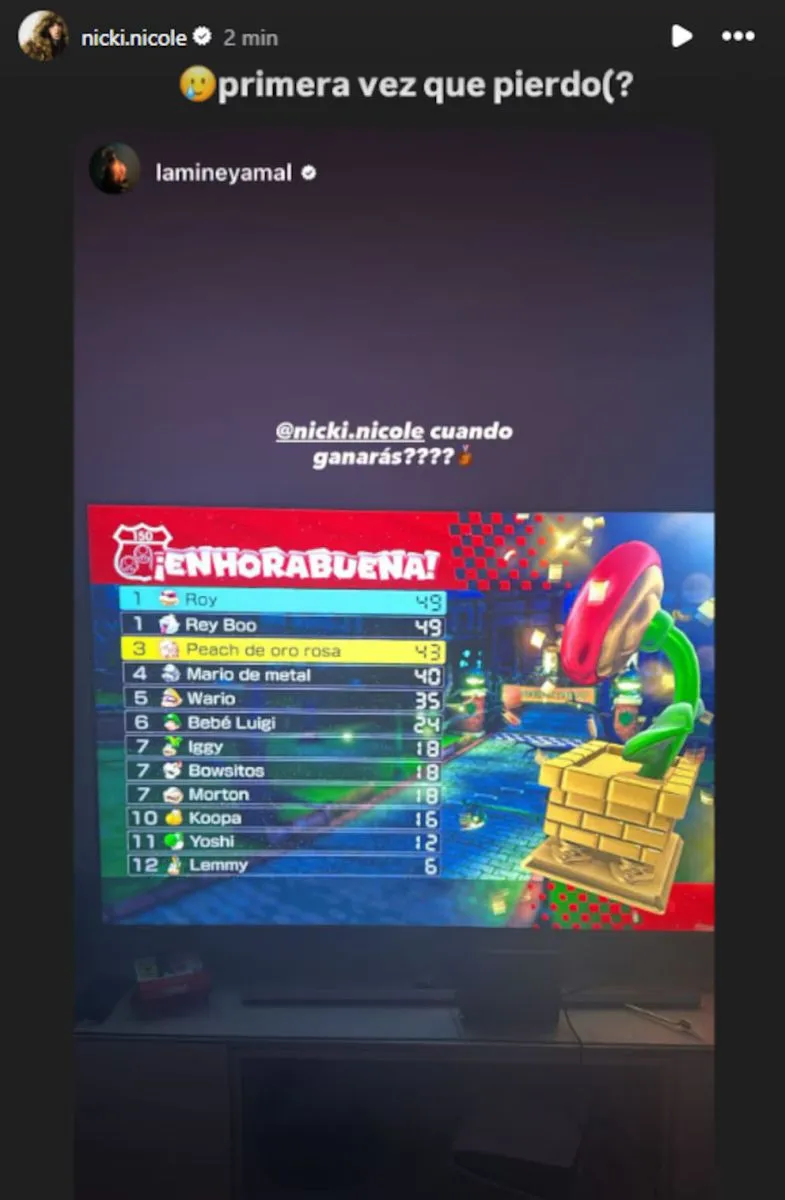 Este martes, Yamal compartió en sus historias de Instagram una imagen de un televisor mostrando una partida de Mario Kart en pantalla dividida. “Roy siempre gana”, escribió junto a un emoji sacando la lengua, mientras se veía un joystick de PlayStation 5 junto a un tenedor, revelando un momento de relajación y cercanía.