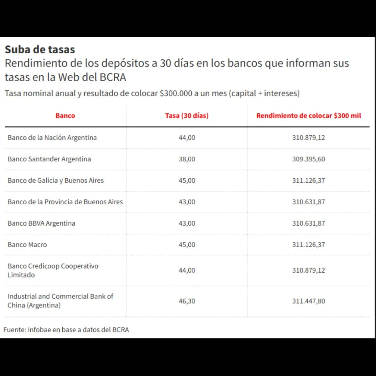 Entre los principales bancos del país, los rendimientos ofrecidos muestran marcadas diferencias. El Banco de la Nación Argentina paga 44%, el Banco de la Provincia de Buenos Aires 43%, mientras que el Banco de la Ciudad de Buenos Aires se encuentra en el extremo inferior con 35%. Entre los privados, el Banco Galicia y Buenos Aires ofrece 45%, el Banco Macro 45%, y el ICBC Argentina encabeza la lista con un rendimiento de 46,3%, según el cuadro comparativo difundido por el BCRA.