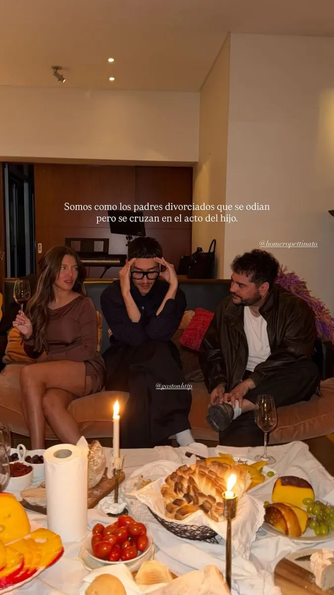 “Somos como los padres divorciados que se odian, pero se cruzan en el acto del hijo”, escribió Gonet en sus stories de Instagram al relatar la situación. En las imágenes, la modelo aparecía sentada al extremo del sillón con una copa de vino, separada de Pettinato por su amigo Gastón Olmos, quien parecía incómodo por la tensión entre los ex.