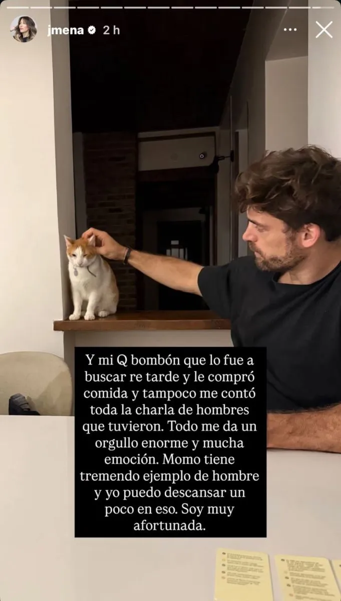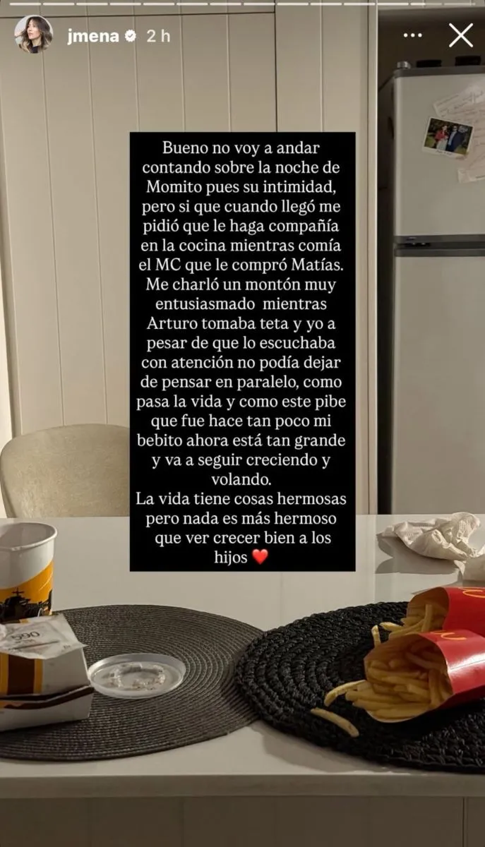 La cantante detalló que, al regresar de la salida, Momo le pidió acompañarlo en la cocina mientras comía la comida rápida que le había comprado su pareja, Matías Palleiro. Entre risas y charlas, Jimena recordó cómo hace poco todavía lo veía como un bebé y ahora comienza a transitar esta nueva etapa de su vida.