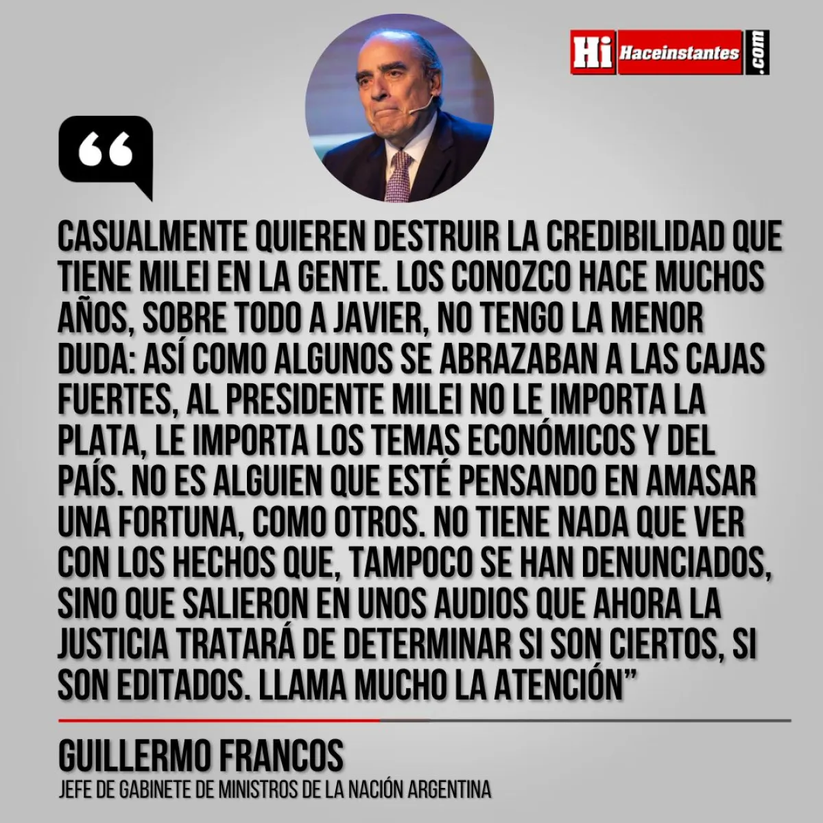 El jefe de Gabinete, Guillermo Francos, salió a despegar al presidente Javier Milei y a su hermana Karina de los audios que hablan de presunta corrupción en la Agencia Nacional de Discapacidad.
