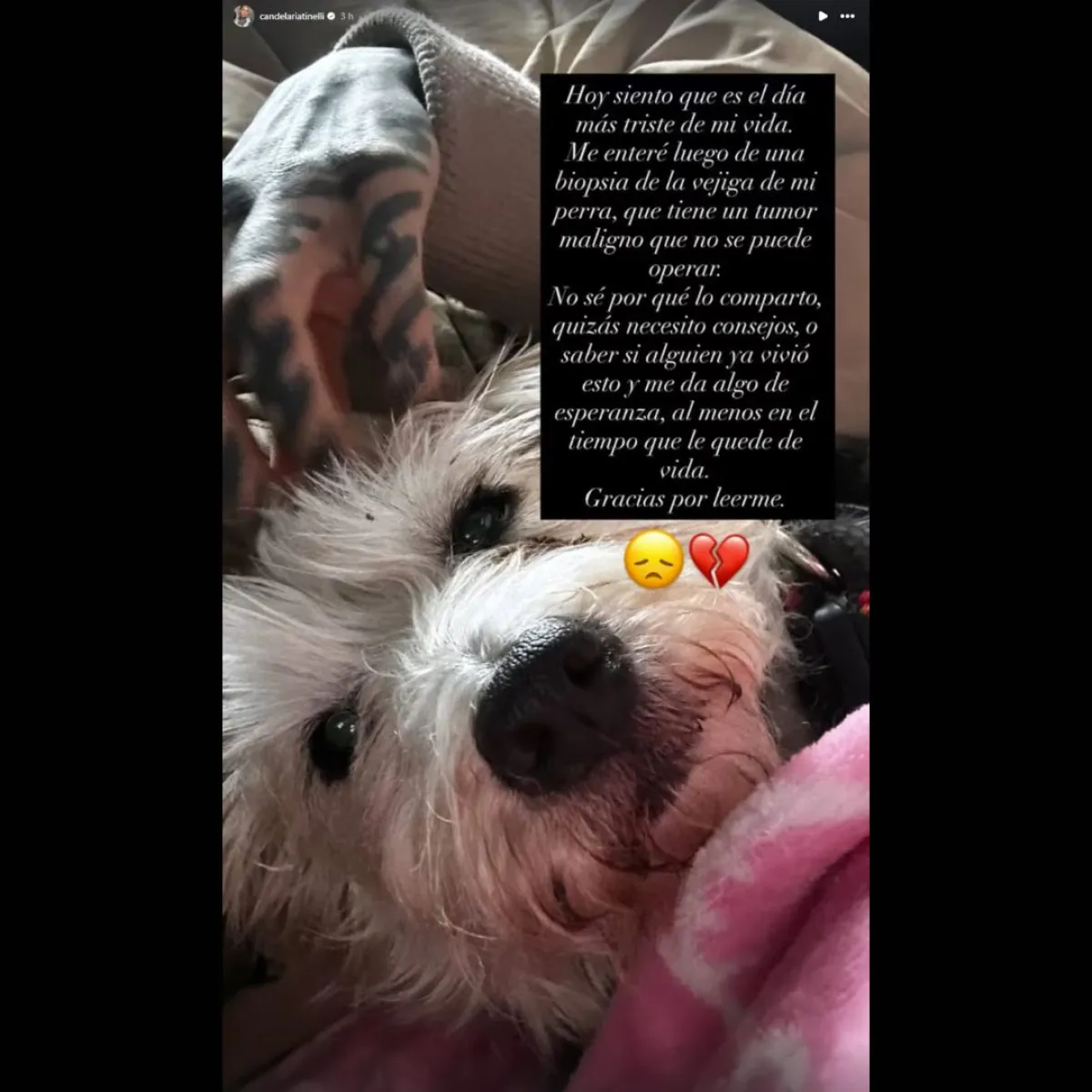 La situación representó un quiebre en el contenido habitual de su perfil, que suele mostrar viajes y momentos glamorosos. En esta ocasión, Candelaria decidió mostrar su vulnerabilidad y abrir un espacio de honestidad frente a sus seguidores, buscando contención y consejos de quienes hayan pasado por experiencias similares, mientras compartía la incertidumbre y el dolor que le provoca el diagnóstico de su mascota.
