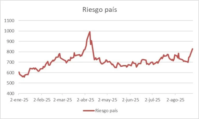 El riesgo país argentino pegó un salto abrupto y superó los 800 puntos básicos, ubicándose en 829 el martes 26 de agosto, según datos del JPMorgan Chase. Este nivel no se observaba desde mediados de abril y coloca al país como el segundo con mayor percepción de riesgo en América Latina, superado solo por Bolivia (1193 puntos); Ecuador, en tanto, se ubica por debajo, con 759 unidades.El incremento estuvo impulsado en gran parte por una fuerte caída de los bonos soberanos en dólares en el comienzo de la semana. El nivel del riesgo país subió casi 100 puntos en un día, lo que refleja la reacción de los inversores ante la creciente incertidumbre política.