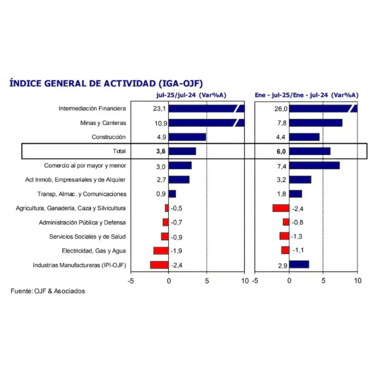 El análisis sectorial mostró resultados heterogéneos. La intermediación financiera lideró el desempeño, con un crecimiento de 23,1% interanual y un alza de 26% acumulada en siete meses. Minas y canteras también registró números positivos, con un incremento de 10,9% anual y 7,8% acumulado, consolidando 53 meses consecutivos de expansión. Por su parte, la construcción mostró recuperación con un avance de 4,9% anual y 4,4% en lo que va del año, mientras que el comercio mayorista y minorista creció 3% y 7,4%, respectivamente, en los períodos indicados.