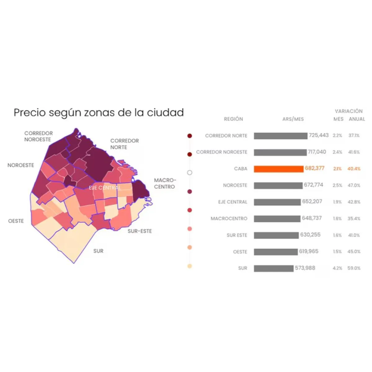 Por barrios, Puerto Madero se mantiene como el más caro, con un alquiler promedio de $1.201.649 por un dos ambientes de 50 metros cuadrados. Palermo y Núñez completan el podio con $753.093 y $745.656 respectivamente. En el otro extremo, Lugano figura como el más accesible con $512.510, seguido por Parque Patricios ($594.749) y Floresta ($600.675). A su vez, Lugano y Nueva Pompeya fueron los barrios con mayor suba interanual, mientras que Puerto Madero registró el menor incremento.
