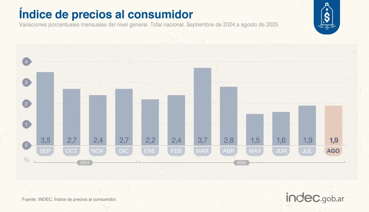 La inflación del mes de agosto de 2025 fue del 1,9%, según el INDEC