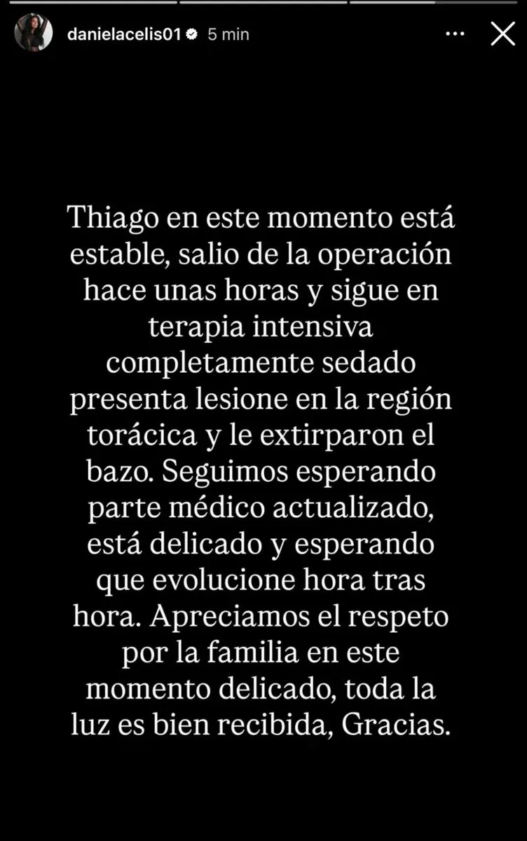 En una historia de Instagram, Celis explicó que el papá de sus hijas está en una condición crítica: “Le extirparon el bazo, está grave”, señaló con gran preocupación. Además, confirmó que permanece en terapia intensiva, completamente sedado y bajo estricto control médico.