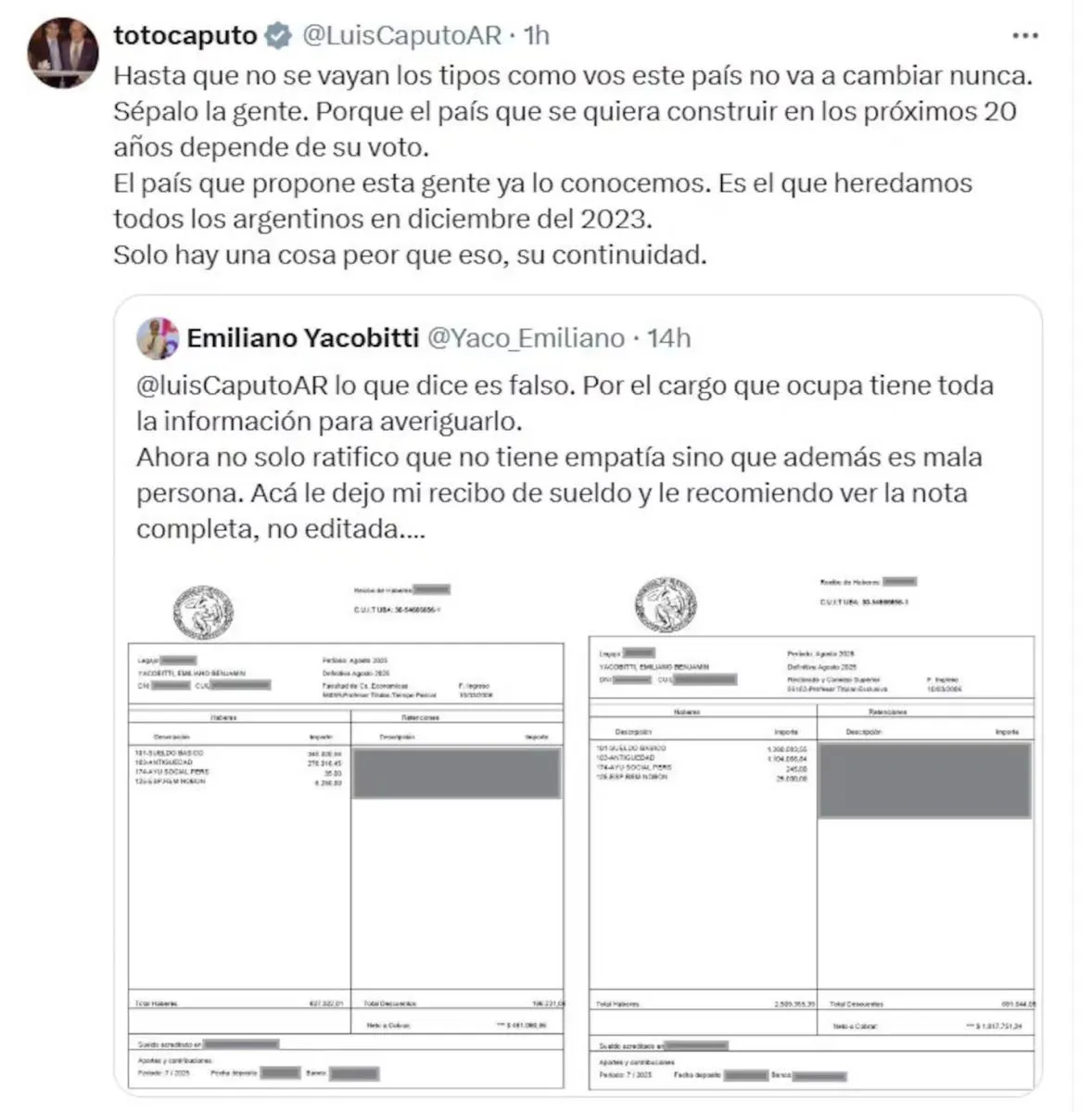 La respuesta no tardó en llegar. A través de la red social X, Yacobitti replicó con dureza: “Ahora no solo ratifico que (Caputo) no tiene empatía, sino que además es mala persona. Acá le dejo mi recibo de sueldo y le recomiendo ver la nota completa, no editada”. En esa publicación mostró sus haberes de agosto: $1.817.751,34 netos como vicerrector y $461.090,95 como docente en Económicas.