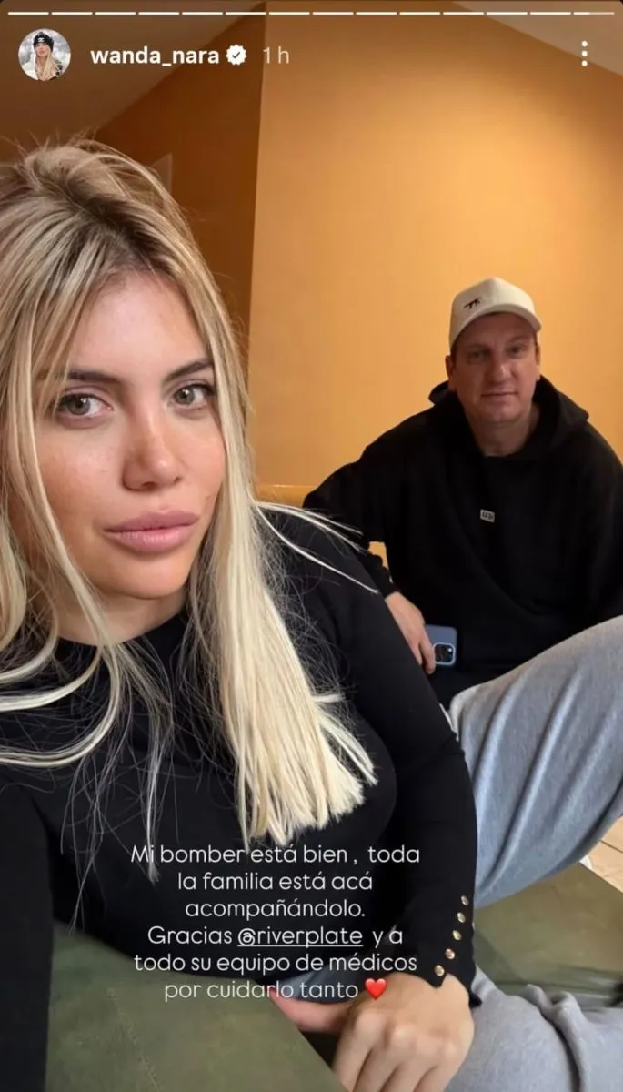 Wanda Nara compartió en sus redes sociales una foto desde la sala de espera junto a Maxi López, escribiendo: “Mi bomber está bien, toda la familia está acá acompañándolo. Gracias River Plate y a todo su equipo de médicos por cuidarlo tanto”. La publicación reflejó la tranquilidad y el apoyo familiar en este difícil momento.