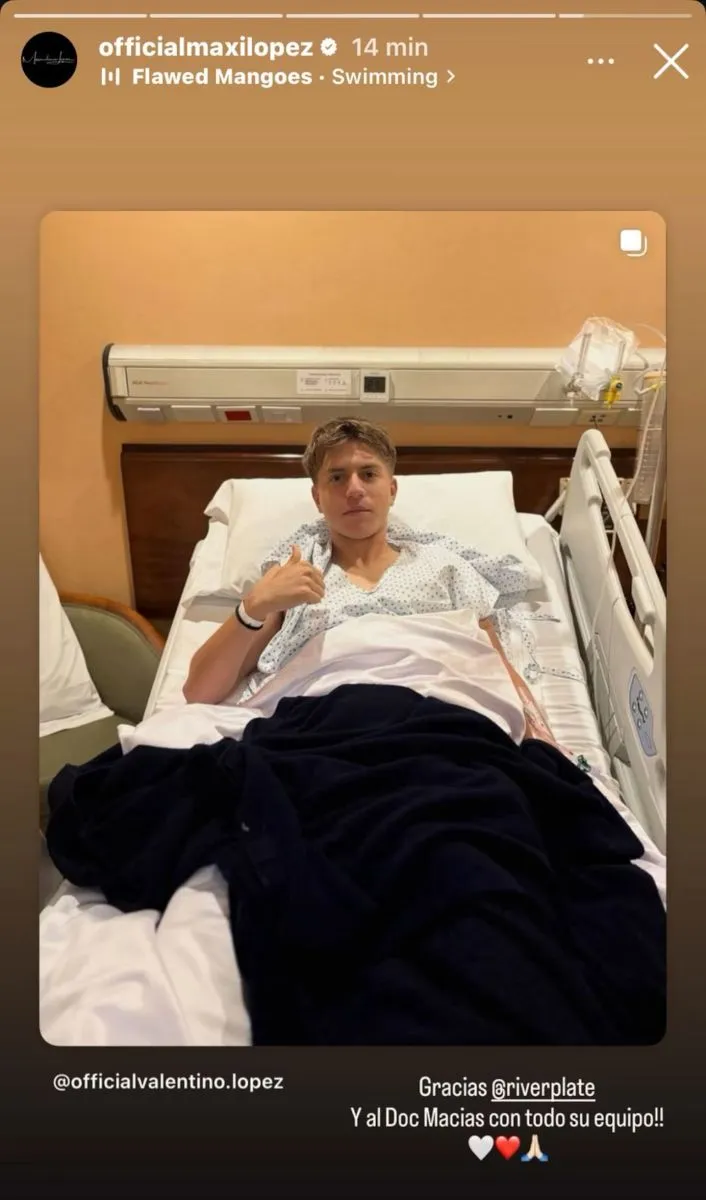 Por su parte, Maxi López mostró a Valentino en la camilla, con el pulgar hacia arriba, en una historia de Instagram. “Gracias River Plate y al doc Matías con todo su equipo”, escribió, enviando un mensaje de calma a sus seguidores.