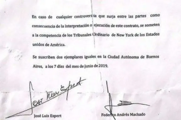 El texto estipula que “el precio total que ‘EL COMITENTE’ se obliga a pagar ‘AL PRESTADOR’ por el trabajo encomendado asciende a la suma de DÓLARES ESTADOUNIDENSES UN MILLÓN (U$S 1.000.000), pagaderos de la siguiente forma: en nueve DÓLARES ESTADOUNIDENSES CIEN MIL (U$S 100.000), en el acto de la suscripción de este contrato”. El hallazgo respalda los dichos que vinculan al economista con Machado, quien había reconocido públicamente haberle entregado una suma de 200 mil dólares.