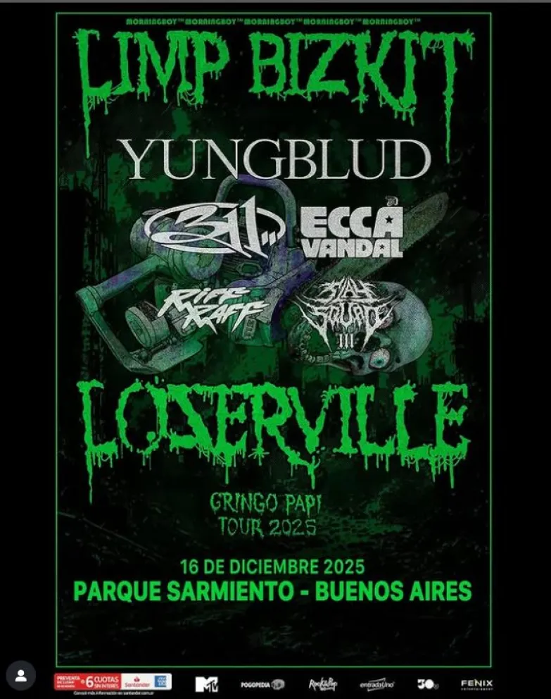 Limp Bizkit finalmente confirmó fecha en Argentina. El próximo 16 de diciembre, el Parque Sarmiento de Buenos Aires será el escenario de un show único. El evento es producido por 30e, la empresa de entretenimiento en vivo más grande de Brasil, junto a Fénix Entertainment. Las entradas están a la venta únicamente en entradauno.com Allá por los 2000, con gorras rojas, riffs pesados y estribillos que combinaban furia y sarcasmo, la banda saltó a la fama y lograron consolidarse como uno de los nombres más icónicos del nu metal, fusionando rap, rock y una actitud burlona que marco a toda una generación. La banda liderada por Fred Durst ha vendido mas de 40 millones de discos y mantiene su energia intacta en el LOSERVILLE TOUR, que comenzó en julio de 2024 y rápidamente se convirtió en un fenomeno: agotó entradas en estadios y revivió grandes éxitos como "Break Stuff" (2000) y "Nookie" (1999), además de sorprender con covers de Nirvana y Rage Against the Machine. La última vez que la banda actuó en Argentina fue en marzo de 2024, cuando cerraron el festival Lollapalooza Argentina en el Hipódromo de San Isidro.