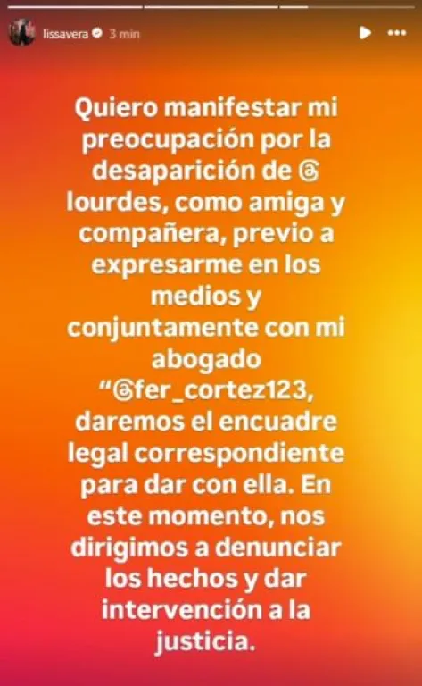 En paralelo, Lissa se manifestó en sus propias redes sociales para visibilizar la situación y reforzar el pedido de intervención judicial: “Quiero manifestar mi preocupación por la desaparición de Lourdes, como amiga y compañera, previo a expresarme en los medios y conjuntamente con mi abogado daremos el encuadre legal correspondiente para dar con ella. En este momento, nos dirigimos a denunciar los hechos y dar intervención a la Justicia”. La cantante buscó transmitir su angustia mientras iniciaba el proceso formal de denuncia.