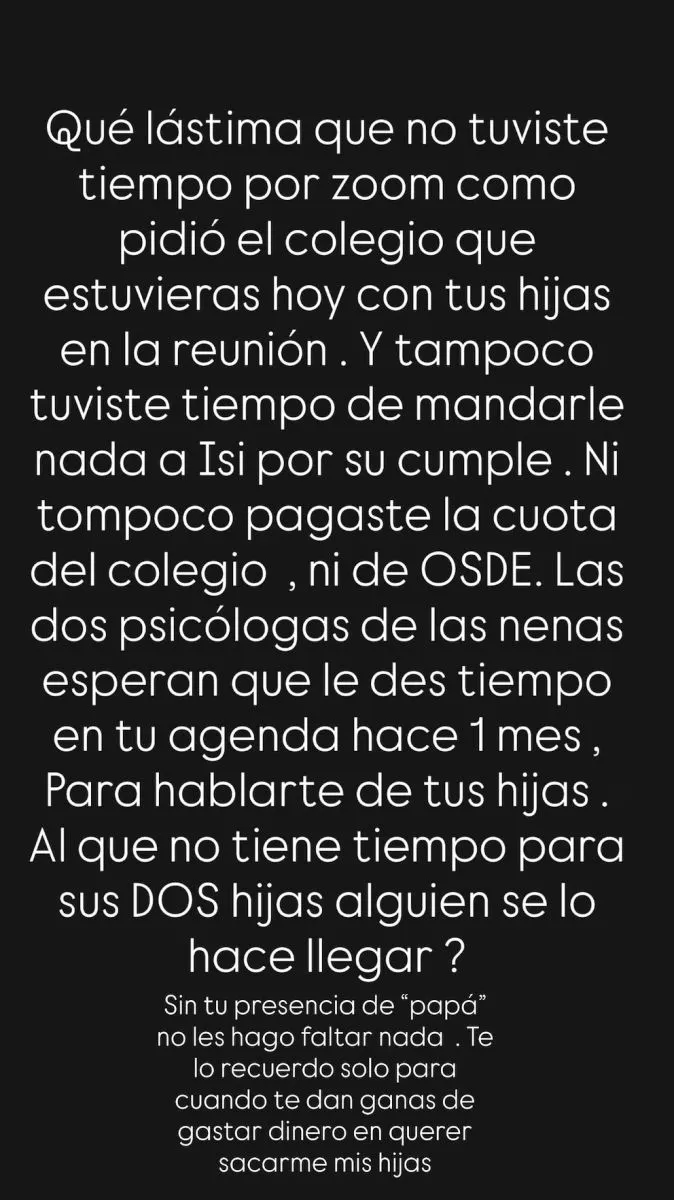 En la misma publicación, la conductora de MasterChef Celebrity fue más allá y detalló varias de sus quejas: “Y tampoco tuviste tiempo de mandarle nada a Isi por su cumple. Ni tampoco pagaste la cuota del colegio, ni de OSDE. Las dos psicólogas de las nenas esperan que les des tiempo en tu agenda hace 1 mes, para hablarte de tus hijas”. Luego, apuntó contra el reclamo judicial de Icardi para mudar a las niñas a Turquía: “Al que no tiene tiempo para sus DOS hijas ¿alguien se lo hace llegar? Sin tu presencia de ‘papá’ no les hago faltar nada. Te lo recuerdo solo para cuanto te dan ganas de gastar dinero en querer sacarme a mis hijas“.