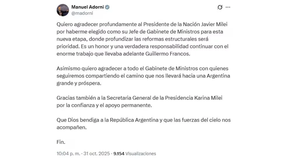 El Gobierno nacional confirmó este viernes la designación de Manuel Adorni como nuevo jefe de Gabinete, reemplazando a Guillermo Francos tras su renuncia. En su primer comunicado público, el ex vocero presidencial destacó que su prioridad será “profundizar las reformas estructurales” y agradeció tanto al presidente Javier Milei como a Karina Milei por la confianza depositada en su gestión.