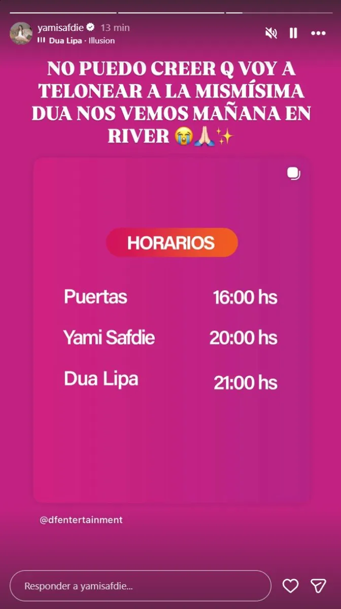 La artista argentina, que viene de compartir escenario con Manuel Turizo en el Movistar Arena de Buenos Aires, no ocultó su felicidad por acompañar a la estrella británica. En sus historias de Instagram, escribió: “No puedo creer que voy a telonear a la mismísima Dua. Nos vemos mañana en River”.