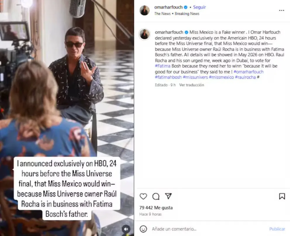 El exjurado también retomó lo que había adelantado en una entrevista para HBO, afirmando que anticipó el resultado un día antes de la final debido a supuestos vínculos comerciales entre el presidente de Miss Universo, Raúl Rocha, y el padre de la concursante mexicana. “Miss México es una falsa ganadora… el dueño de Miss Universo, Raúl Rocha, tiene negocios con el padre de Fátima Bosch”, aseguró en un comunicado que compartió en Instagram, reforzando su denuncia con material registrado antes de la competencia.
