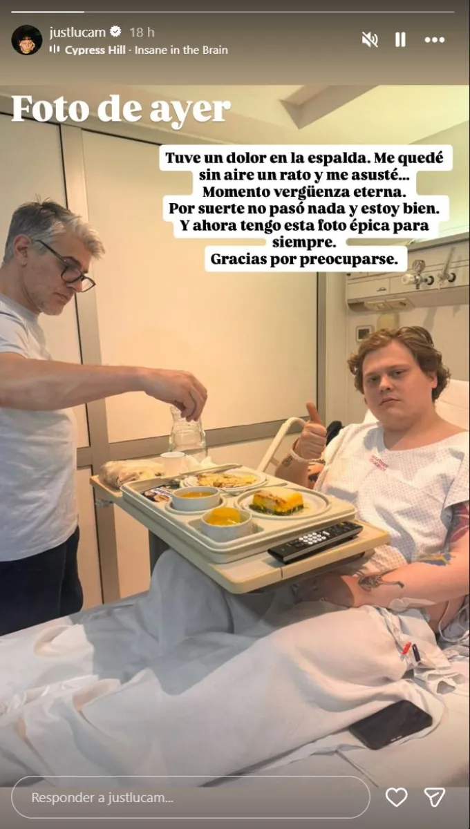 A través de sus historias de Instagram, el joven contó el motivo de su internación. “Foto de ayer. Tuve un dolor en la espalda. Me quedé sin aire un rato y me asusté”, relató, acompañando sus palabras con una imagen donde se lo ve recibiendo atención médica. Después, intentó llevar tranquilidad a quienes se preocuparon: “Momento vergüenza eterna. Por suerte no pasó nada y estoy bien y ahora tengo esta foto épica para siempre”.