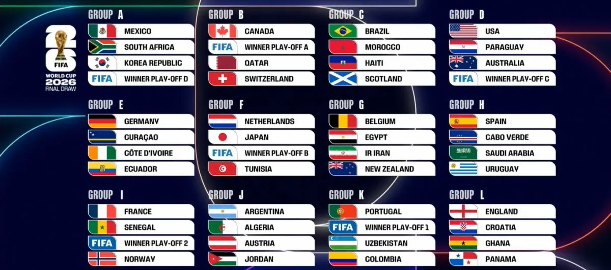 El Grupo A quedó conformado por México, Corea del Sur, Sudáfrica y el clasificado de la UEFA 4. En el Grupo B aparecen Canadá, Suiza, Qatar y el representante UEFA 1. El Grupo C tendrá a Brasil, Marruecos, Escocia y Haití, mientras que el Grupo D contará con Estados Unidos, Australia, Paraguay y UEFA 3. Alemania, Ecuador, Costa de Marfil y Curazao integran el Grupo E, y en el Grupo F competirán Países Bajos, Japón, Túnez y UEFA 2.